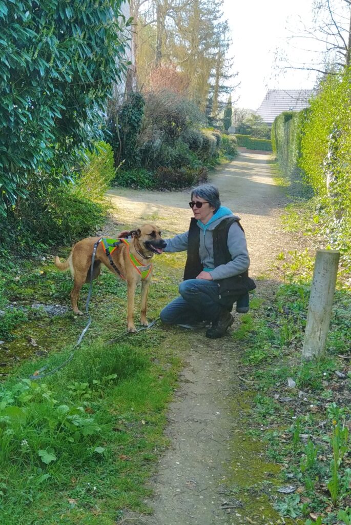 Le chien porte un harnais de travail et est relié à son humain par une longe. Le binôme progresse ensemble en suivant les indications du chien.